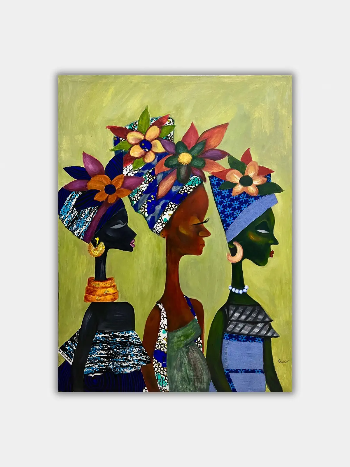 NdU showcases my beautiful women of colour, adorned in African prints and Jewelry. They exist within an uneven green background, intentional because life is not perfect, yet it is beautiful.